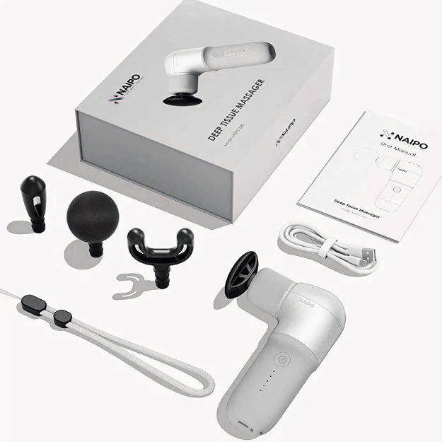 فوق العاده سبک و قابل حمل، 5 سرعت، 4 سر قابل تعویض دسته ارگونومیک – تفنگ ماساژ کوچک NAIPO به شکل L معکوس با یک دسته بدون لغزش است که کمی در پایین باریک می شود. طراحی شده تا کار با یک دست را راحت و آسان کند.